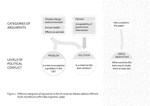 Taking ‘arguments’ as the unit of analysis (e.g. “UK meat production is sustainable”, “a meat tax would reduce healthcare costs”) we found these fit into five categories: climate change and environment, human health, effects on animals, fairness, and acceptability of government intervention. We then further divided each category according to the level of political conflict, i.e. was this argument about the nature of the problem, or about the proposed solution? Finally, we sought to interpret the arguments through the lenses of different political ideologies and different perspectives on sustainable food security.